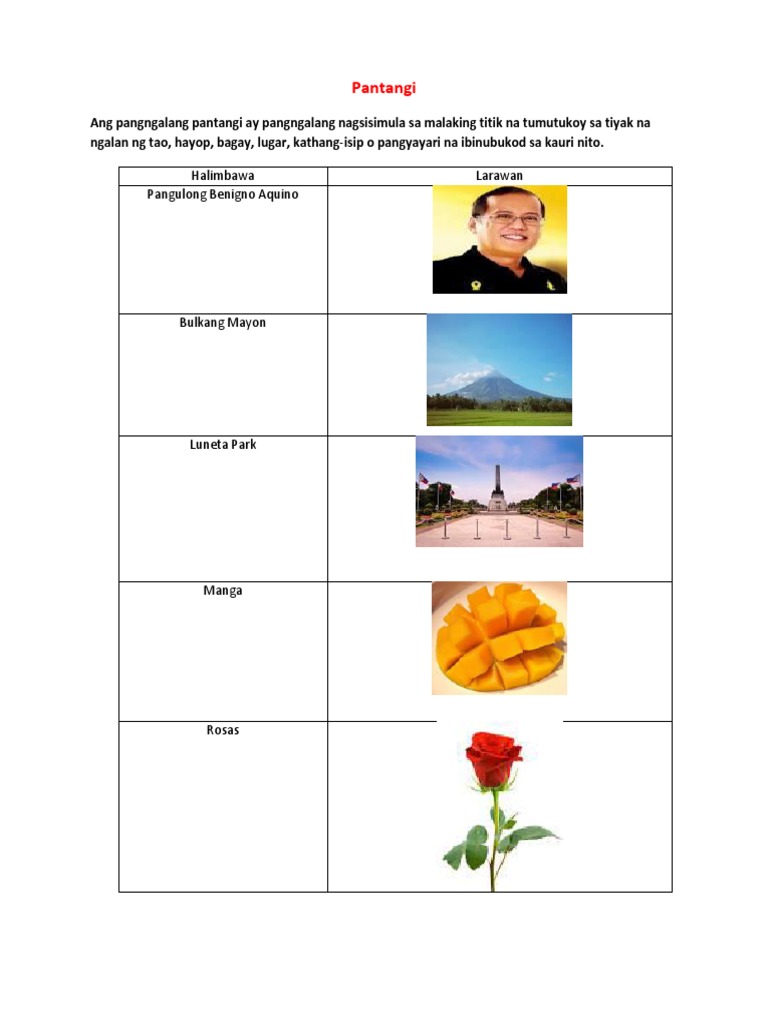Ano ang halimbawa ng pangalang pantangi. Pumunta sa palengke ng maaga ang tindero upang makarami ng benta. Filipino Ano ano ang kahalagahan ng wikang filipino sa panitikan. Ano ano ang halimbawa ng pangalang pantangi.