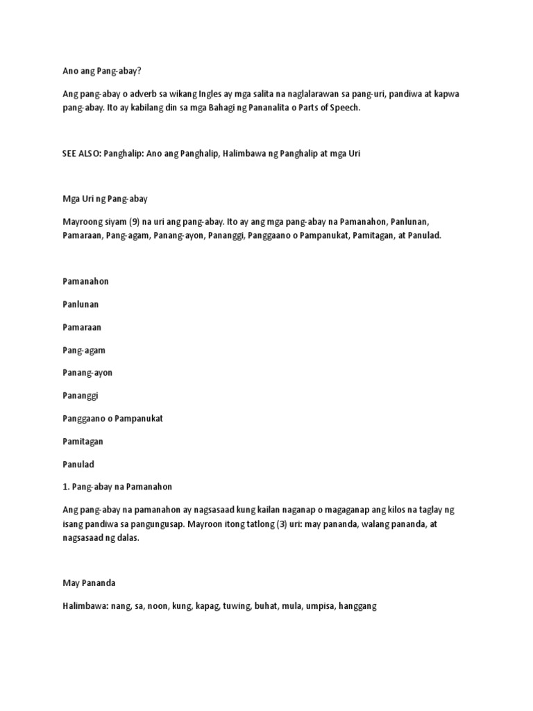 Ano ang mga halimbawa ng pang abay na panulad. Ang pang-abay na pamanahon ay nagsasaad kung kailan naganap o magaganap ang kilos na taglay ng isang pandiwa sa pangungusap. Ang pang-abay ay isang salita na naglalarawan sa isang pandiwa pang-uri o sa kapwa nito pang -abay. 1pang-abay na pamanahon hal.