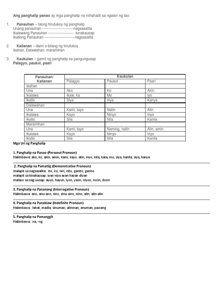 Panghalip panao sa Ng Isahan ko mo niya Maramihan natin namin ninyo nila Panghalip pamatlig sa Ng Isahan nito niyan niyon noon Maramihan ng mga ito ng mga iyan ng mga iyon Pangngalan sa Sa. Kaukulang palagyo- kung ang panghalip ay ginagamit bilang simuno subject ng pangungusap. Ito ay may kaukulan panauhan at kailananKaukulan ay ang kakayahan na nagpapakita ng gamit nito sa pangungusap.